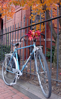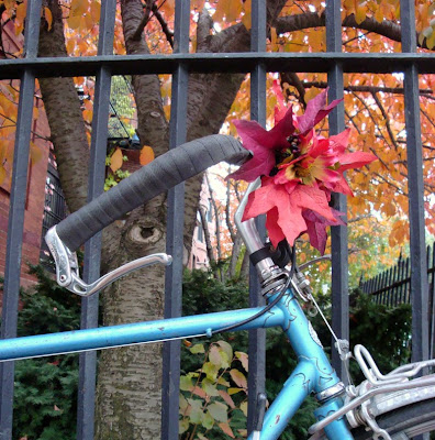 To celebrate that it’s FRIDAY I’m giving away a bike corsage made with the rest of the flowers from my helmet spray. It’s not terribly well-made, it just ties on with a red ribbon, but it’s free to the first person who emails me with the understanding that you’ll send a photo of the flowers on your bike to be published here on the blog. Please, responders located in North America only.