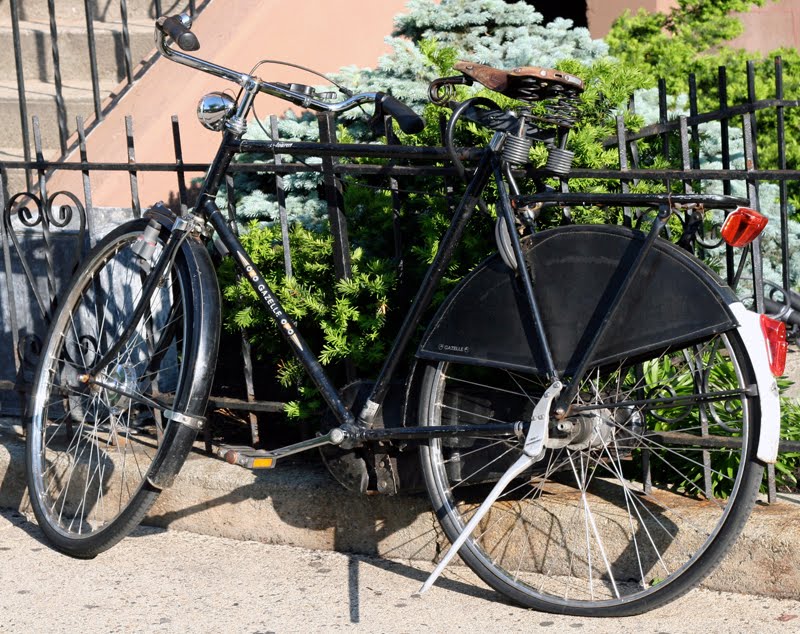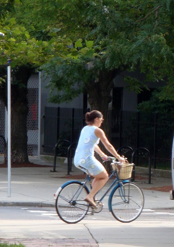 Love this blonde’s bi-color bike, do you suppose she’s an artist or an architect? What else might those rolls of paper be used for?