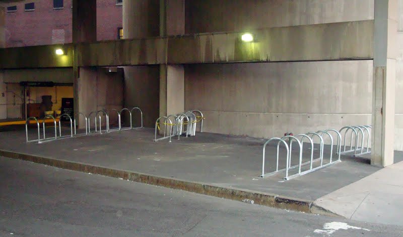 The upside of all this parking is that there is certainly a lot of it, it’s in an area with a paucity of bike racks, and the entire area is covered for protection from the elements. Downside is that the entire area is covered because it’s a tunnel freeway entrance for the Mass Pike. It’s a great use of space for a much-needed resource, but beware of “freeway-minded” drivers folks!