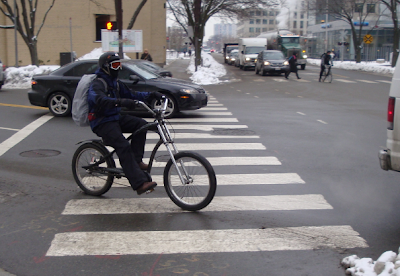 Wednesday, January 19th, 2011Today I got to ride for the first time since the big snowfall last week. What a relief it was! I was in a much better mood all day and I honestly felt safer in the street – the plows and salt/sanding made the road surfaces much more consistent than the sidewalks and by avoiding rush hours I had no problem taking the lane when needed.